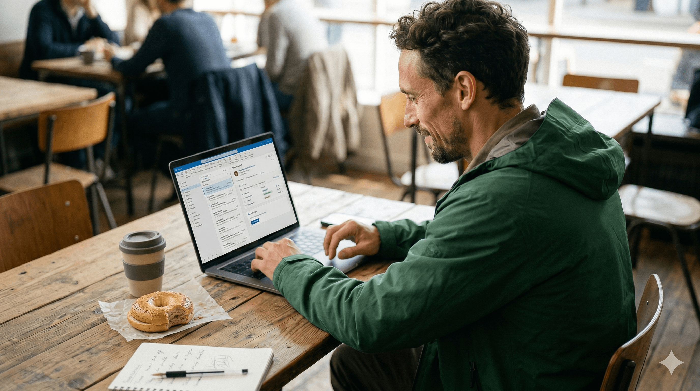 Laptop open. Bagel half-eaten. Brandhat turned the best ideas into real content. No brief, no back-and-forth — just review, tweak, publish.